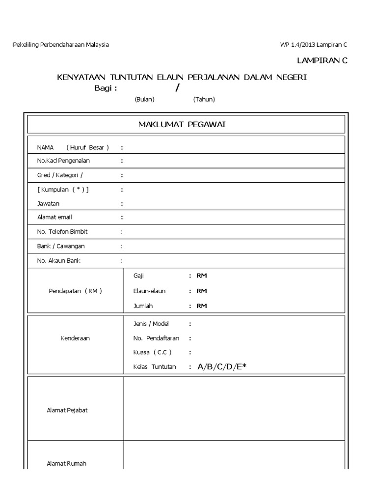 Teksi Bas 500 km pertama 500 km selepas 700 km selepas Setiap km selepas. Borang Justifikasi Kelewatan Mengemukakan Tuntutan Perjalanan. BORANG TUNTUTAN ELAUN PERJALANAN DALAM NEGERI MAKLUMAT PEGAWAI Pendapatan RM Kenderaan Alamat Pejabat Alamat Rumah Pegawai Diisi oleh pegawai yang layak membuat tuntutan Perjalanan di bawah PP WP16.