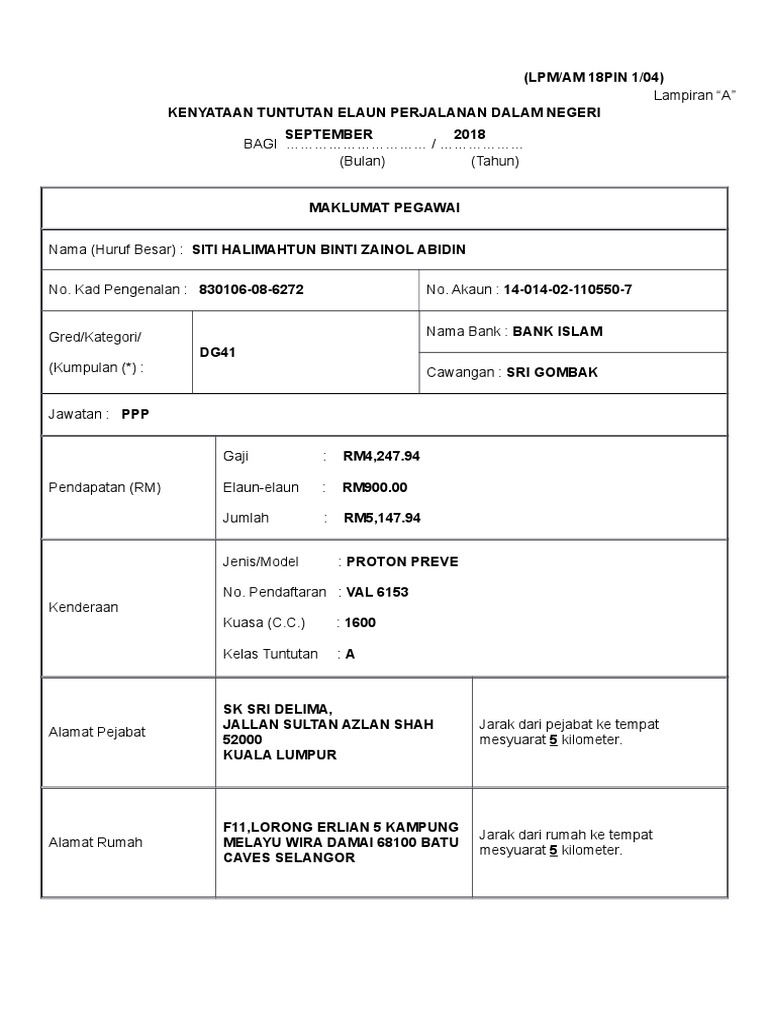 Borang ini hendaklah diisi dengan lengkap dan dikemukakan tidak lewat daripada 10 hari bulan dalam bulan yang berikutnya. 12-113-02-012491-1 1 Nama Alamat Bank. Garis Panduan Tuntutan Perjalanan Dalam Negeri dan.